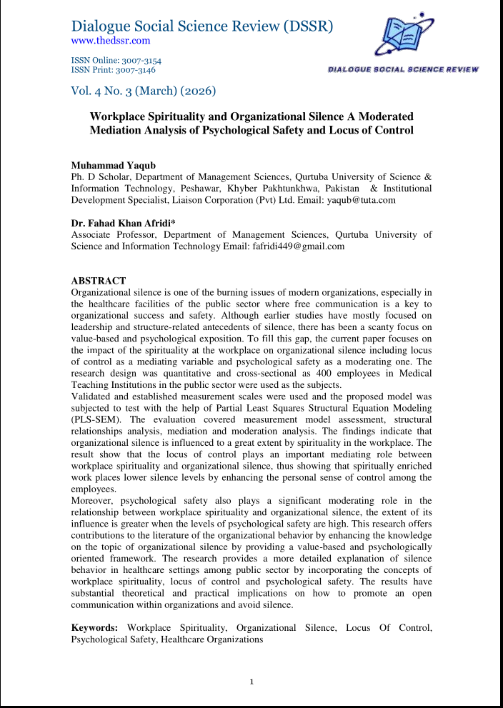 3. Muhammad Yaqub, & Fahad Khan Afridi. (2026). Workplace Spirituality and Organizational Silence A Moderated Mediation Analysis of Psychological Safety and Locus of Control. Dialogue Social Science Review (DSSR)4(3), 1–20. Retrieved from https://dialoguesreview.com/index.php/2/article/view/1529