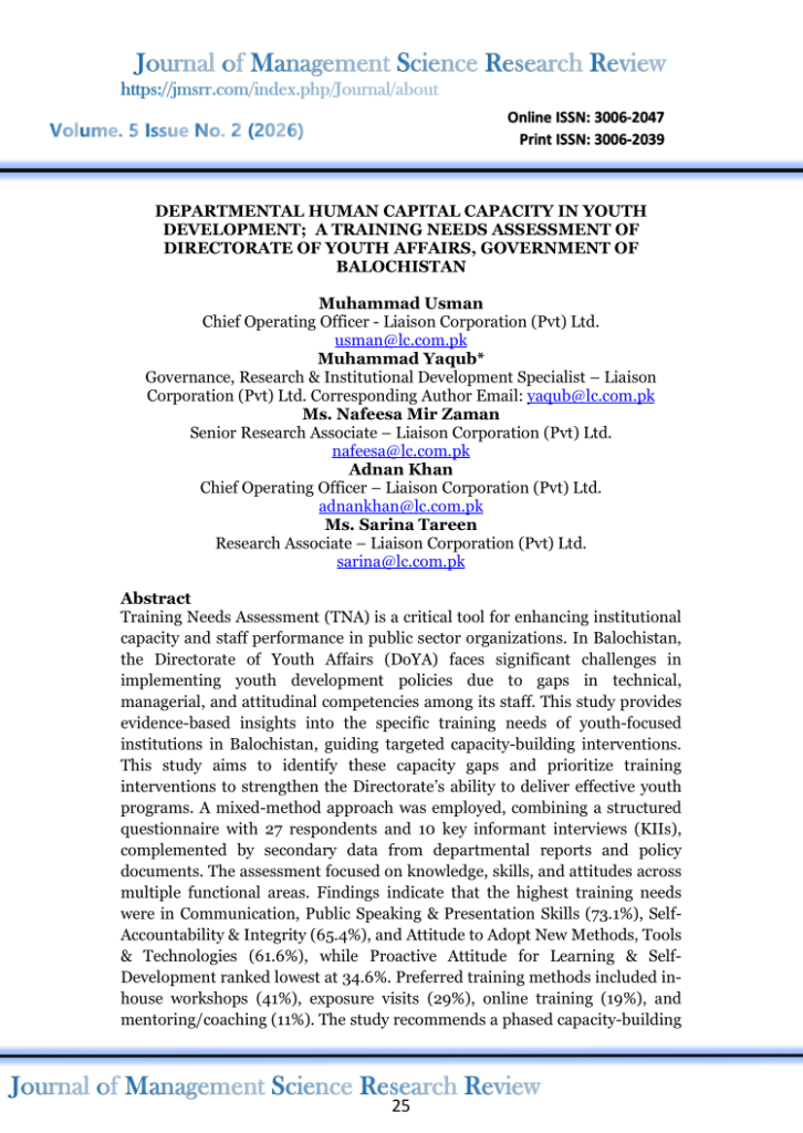 1. Usman, M., Yaqub, M., Mir, N., Khan, A., & Tareen, M. S. (2026). Departmental Human Capital Capacity in Youth Development; A Training Needs Assessment of Directorate of Youth Affairs, Government Of Balochistan. Journal of Management Science Research Review, 5(2). https://jmsrr.com/index.php/Journal/article/view/490
